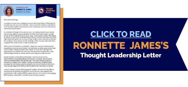 Ronnette has been active in the Orange community for 20 years. As a mom, she served as PTO president at Peck Place School and worked on several town committees with passion and enthusiasm.